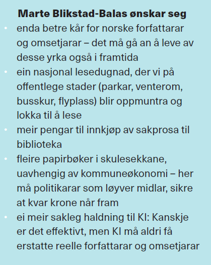 Blikstad-Balas vil òg jobbe for auka fondsmidlar til NFFO og betre sosiale ordningar for frilansarar og omsetjarar.