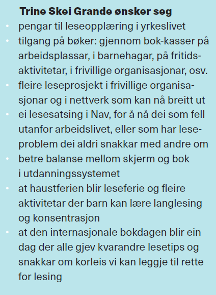 Skei Grande ønskjer seg både fundamentale endringar i store system og ei rekkje små tiltak (sjå ønskeliste). Ho oppmodar også alle vaksne om å lese høgt for barn. Høgtlesinga går nemleg nedover, trass i at ho styrkjer ordforrådet og er med å utvikle den evna barnet har til å resonnere og tileigne seg kunnskap.