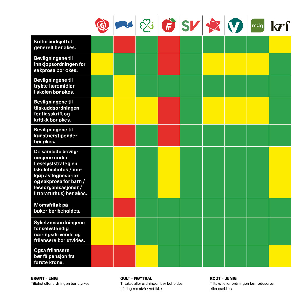 SV har den bredeste kulturpolitiske satsingen, men det er ikke mye som skiller partiene på rødgrønn side. Arbeiderpartiet og SV har lange tradisjoner for en god kultur- og litteraturpolitikk, og er trygge valg. Selv om Rødt og MDG har gode satsinger på kunstnerøkonomi og lærebøker, er de usikre kort da det er andre saker som blir langt viktigere for disse partiene om de skulle få en finger på rattet.