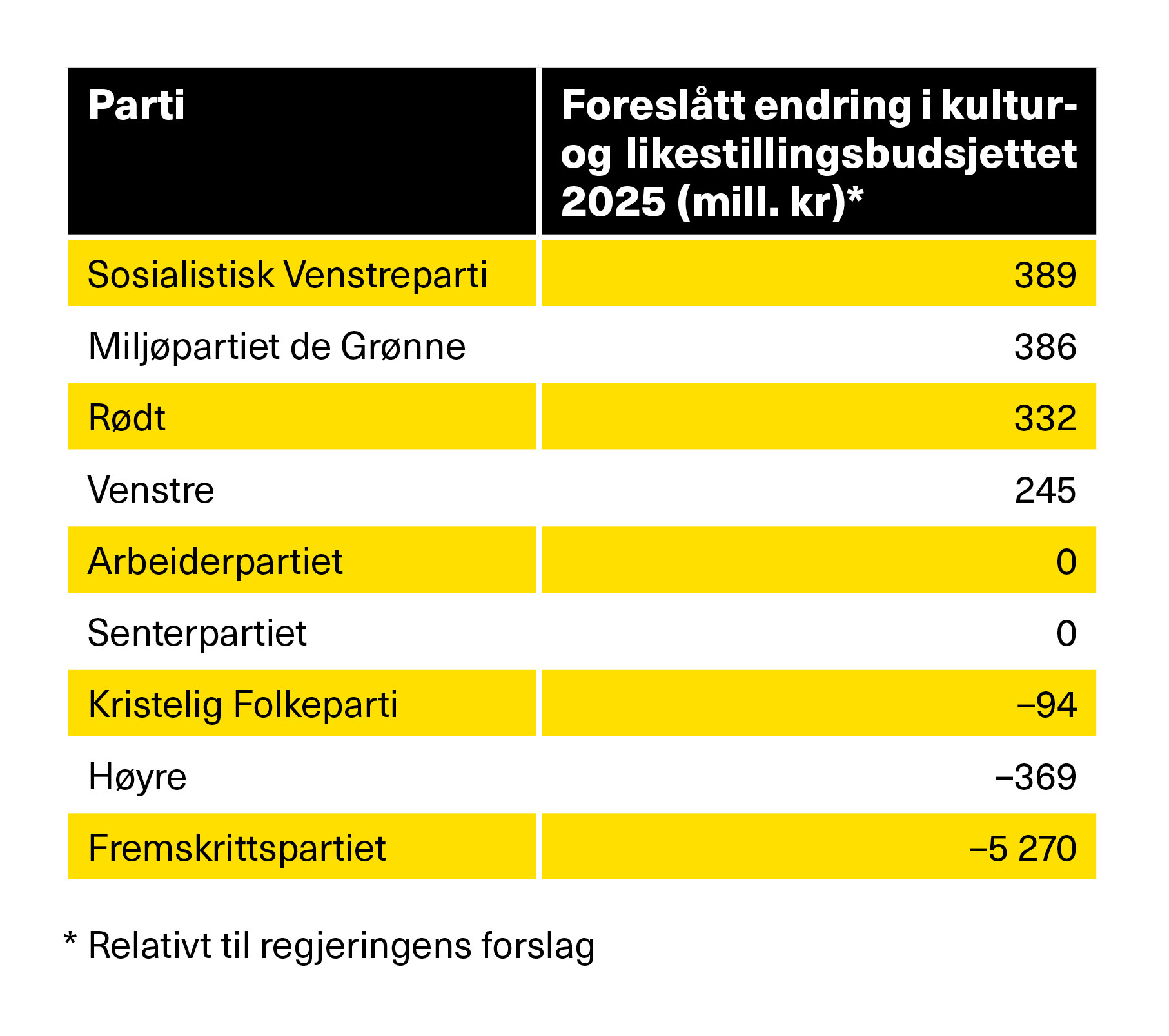 Når vi ser til den samlede kultursatsingen i statsbudsjettet for 20251, er det liten forskjell mellom SV, MDG og Rødt, som foreslår en styrking av rammen på kultur-og likestillingsbudsjettet på mellom 300–400 millioner kroner sammenlignet med regjeringens forslag. Venstre er ikke langt bak. KrF foreslår et lite kutt i rammen.