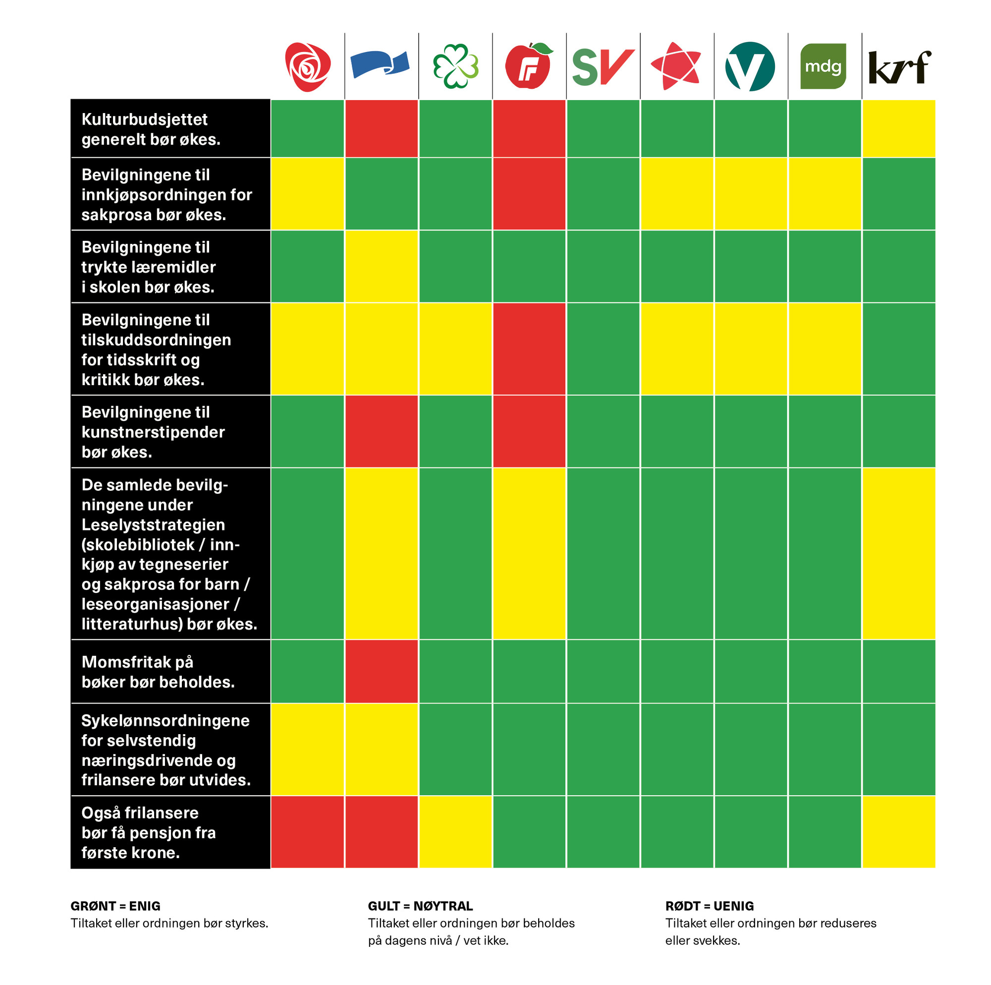 De fleste partiene er enige om å videreføre dagens kultur- og litteraturpolitikk, med noen moderate forbedringer. Fremskrittspartiet og Høyre skiller seg ut i negativ forstand – FrP med sine drastiske kutt i kulturbudsjettet, Høyre med sine forslag om å innføre moms på bøker og et stort kutt i Norsk kulturfond. Et rødgrønt flertall vil helt klart være å foretrekke, alene fordi Høyre og FrP innvarsler dårlig nytt for feltet.