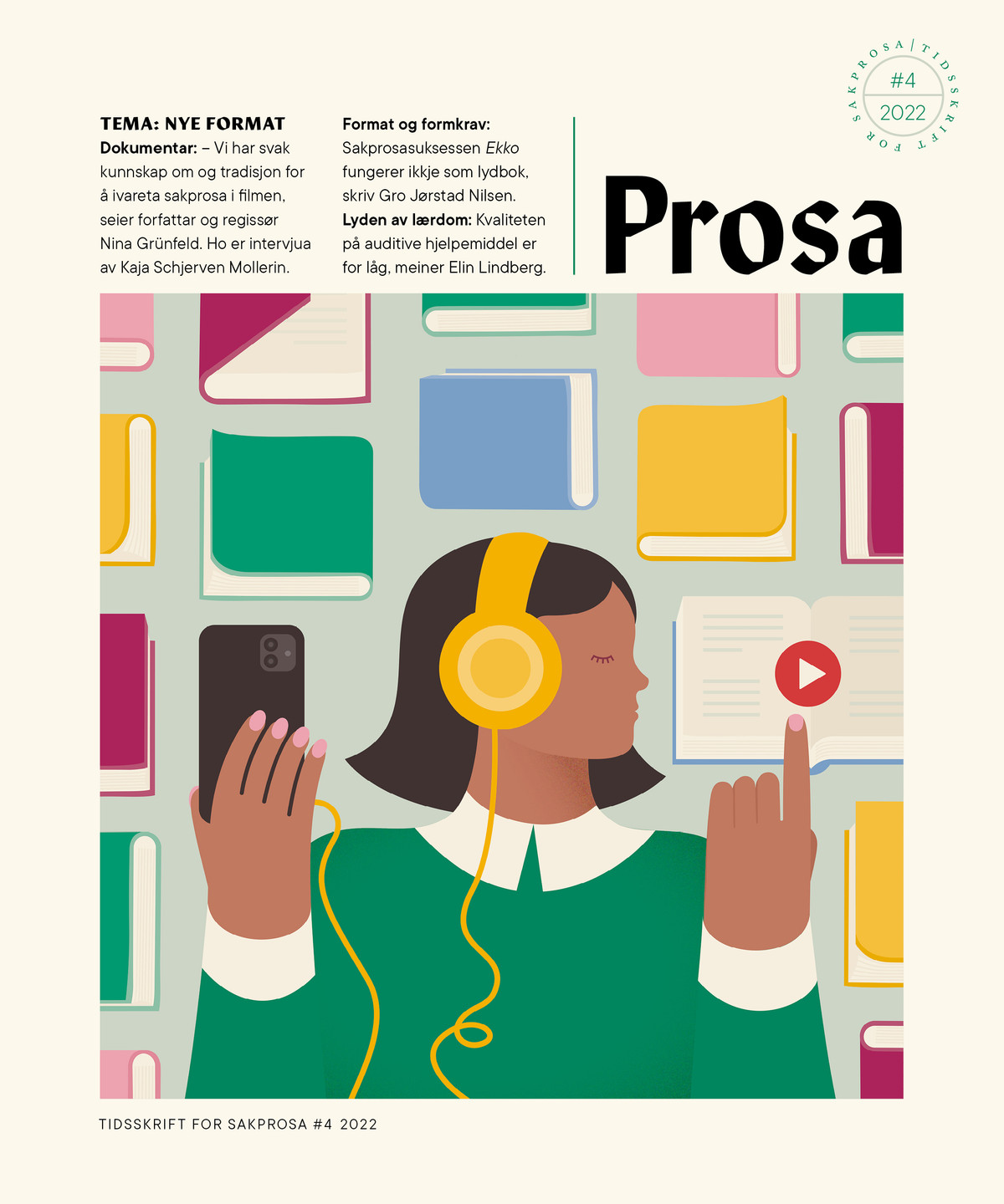 I Prosa #4 22 ser vi på problemstillingar kring bruk av sakprosa i format som lydbok, dokumentarfilm og podkast. Mange av artiklane vitnar om at utviklinga ikkje berre har bydd på mogelegheiter, men også ein kompleksitet som kan vere krevjande.