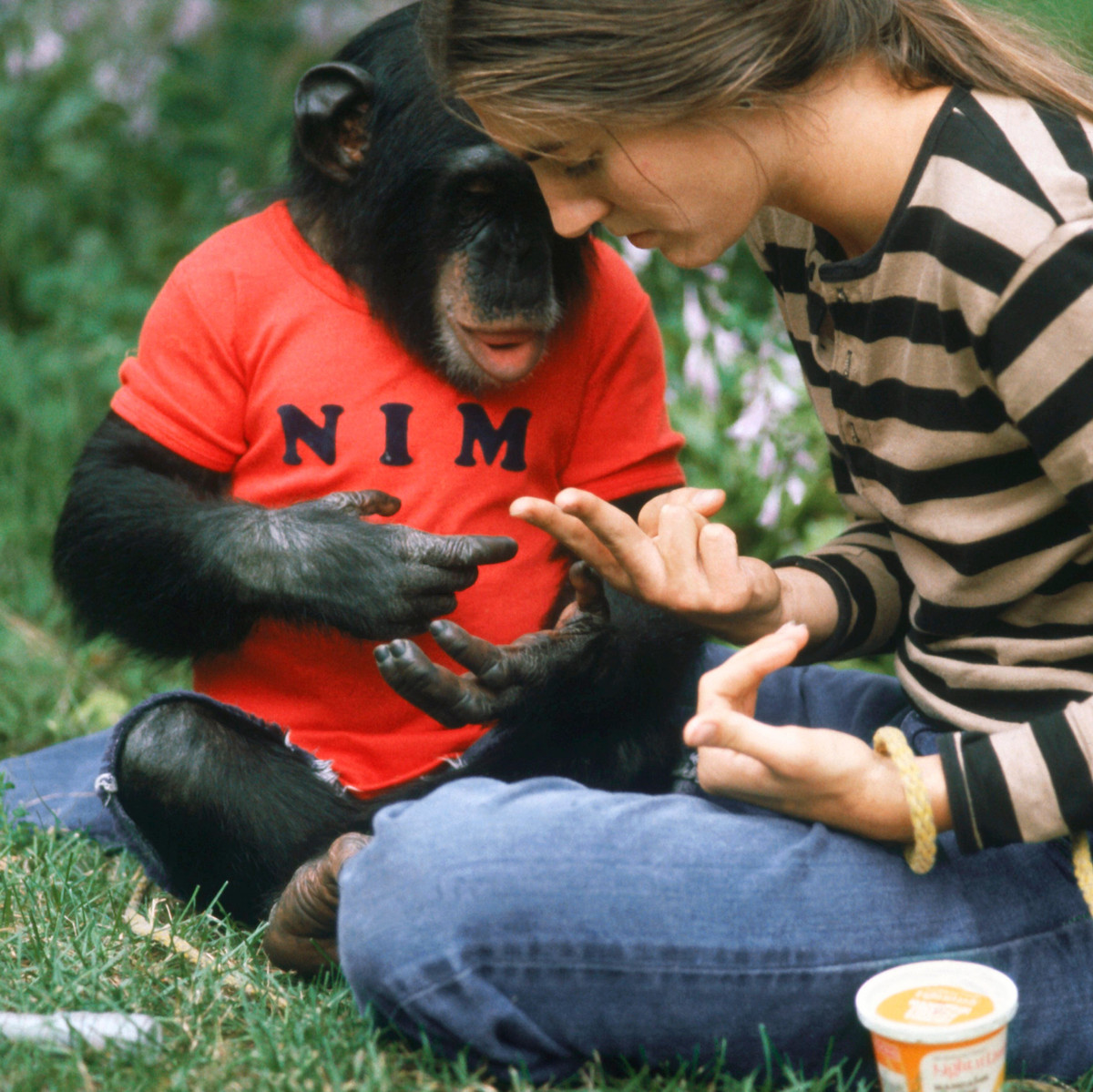 Det omstridte eksperimentet med sjimpansen Nim Chimpsky (1973–2000) var ment å skulle bevise Chomskys teorier. Psykologiprofessoren Herbert Terrace, som ledet forsøket, mente å kunne avkrefte tidligere undersøkelser som angivelig dokumenterte mestring av et anselig tegnvokabular samt evne til kreativ «språkbruk» hos primater og andre dyr. Chimpskys bruk av tegn kunne forklares, mente han, som betinget av belønningen han fikk. Da det lite kommunikative forsøksdyret begynte å bli utagerende, ble han overført til et dyremottak. Året etter døde han av et hjerteattakk.