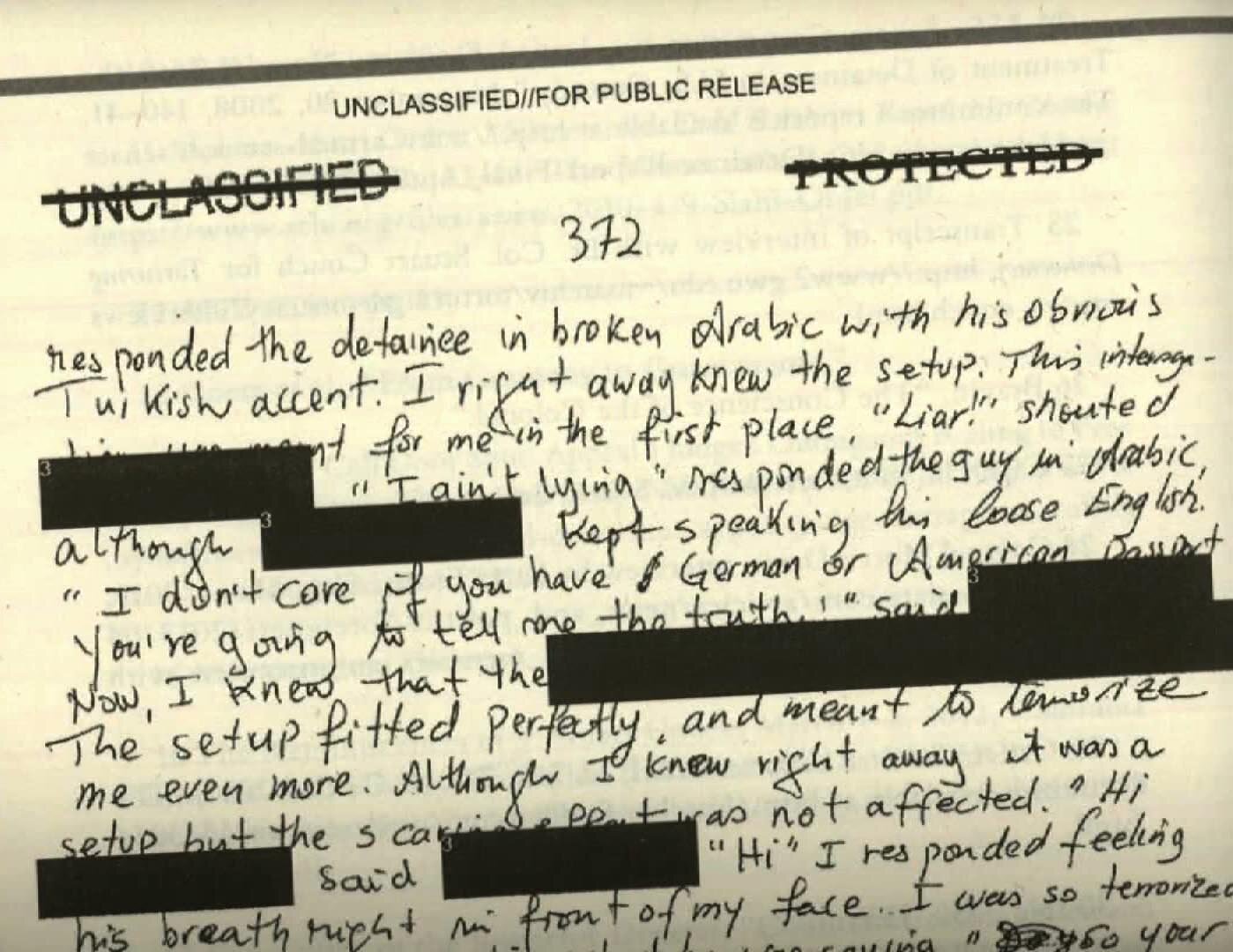 Store delar av Dagbok fra Guantánamo er slik, eit flettverk av blokkerte ord, passasjar og sider, som Siems har brukt store krefter på å tyde, ved å sjekke ulike kjelder. Fotnoteapparatet er umisteleg i denne teksten. Det er her nokre av dei anonymiserte torturistane vert identifiserte, og, like viktig, det er her den feilslåtte torturlogikken avteiknar seg mest tydeleg. Som notane gjer klart, var skuldingane mot Slahi baserte på vitneprov frå torturavhøyr som liknar dei han sjølv vert utsett for. Langvarig isolasjon, smertefull fastlenking, dynking med isvatn, slag mot ulike delar av kroppen, seksuelt misbruk, drapstruslar mot familien og påført søvnløyse – kven hadde ikkje vore viljug til å innrømme kva som helst etter å ha vorte utsett for slikt? Slik går det også med Slahi.