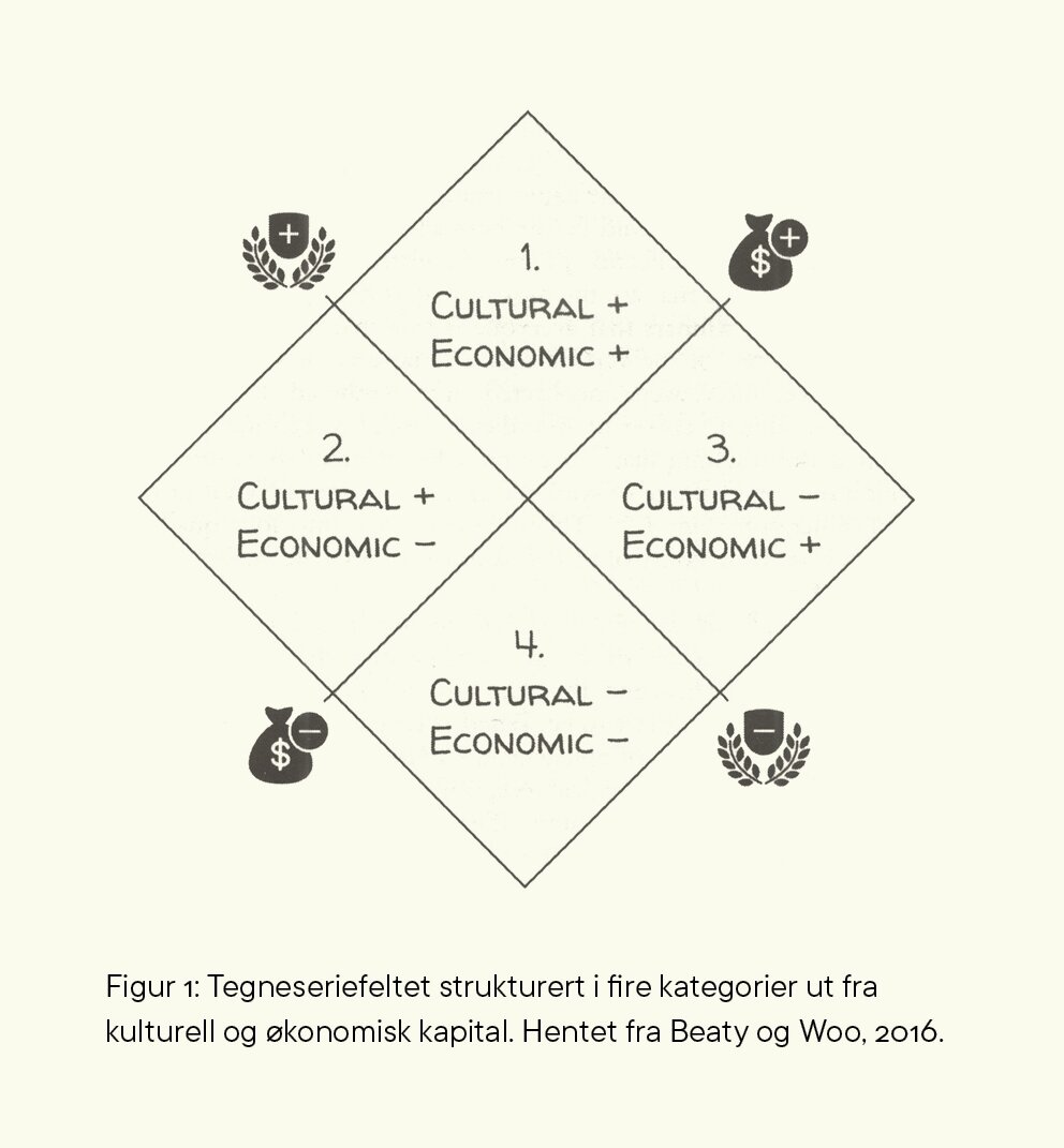 I boken The Greatest Comic Book of All Time15 argumenterer de canadiske akademikerne Bart Beaty og Benjamin Woo for at en tegneseries storhet ikke er et iboende, objektivt element i verket, men en vurdering av serien fra premissgivende aktører. Med utgangspunkt i Pierre Bourdieus teorier om symbolsk kapital på kulturfeltet, analyserer de hvordan status vurderes og en kanon skapes innenfor tegneseriene. Modellen deres har to diagonale akser, der den ene uttrykker økonomisk kapital (salg) og den andre kulturell kapital (prestisje). Den sorterer seriene i fire kvadratiske felt, der det øverste angir både økonomisk og kritisk suksess (se figur 1).