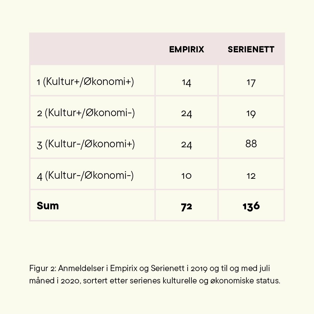 Ved å anvende denne kategoriseringen på anmeldelsene hos Empirix og Serienett, og plassere seriene etter beste evne, kommer det frem vesentlige forskjeller i utvalget (figur 2). Empirix hadde totalt 72 anmeldelser i 2019 og til og med juli måned i 2020, når de av blogginnleggene som er kritikk regnes med. Serienett hadde 136 anmeldelser i samme periode (11 av dem omhandlet fjorårets julehefter). Nesten alle utgivelser på norsk som Empirix anmeldte, ble også anmeldt i Serienett. En del utenlandske serier er Empirix alene om å anmelde, og en betydelig andel tilhører den uglesette kategori 4, altså serier som verken selger eller er anerkjent fra før. De fleste av disse anmeldelsene i spalten kalt «Indiebloggen» er svært positive, og tyder på et ønske om å introdusere nye titler i kanon.