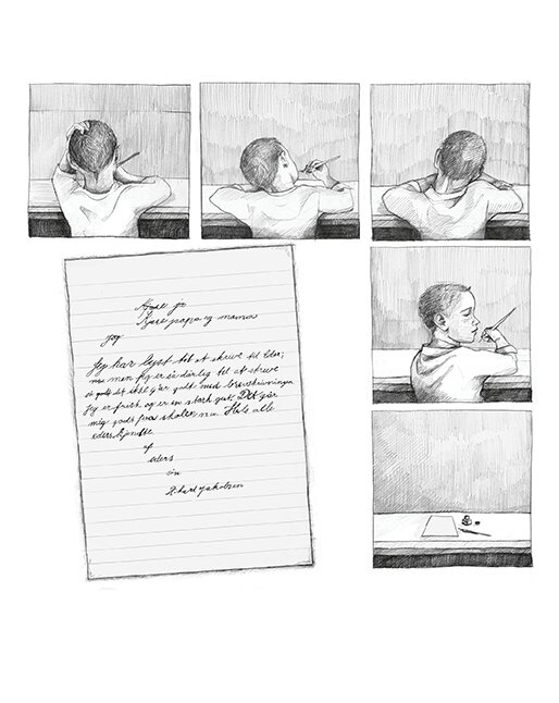 Om eg skal velje meg ei favorittside i boka, er det likevel side tretti. Der finn vi Rikard ved skrivebordet, der han kavar med å skrive eit brev til far sin. Tre små ruter øvst på sida gjer bruk av teikneseriens eigen måte å vise tid på. Tid som går. Skrivetid, for ein som kjempar med det. Midt på sida ligg brevarket som har inspirert Ask til komposisjonen som vart side tretti. «Jeg har lyst til at skrive til Eder; men jeg er så dårlig til at skrive så det ikke går godt med brevskrivningen.» I dei to rutene til høgre for brevarket ser vi augneblunken kvar ein skrivande kjenner: Det er der distraksjonen oppstår. Det blanke arket, blekkhuset og pennen vert liggande att på bordet. Rikard er forsvunnen ut av sida, ut av rommet. Han har verksame hender, men det er barnehender, rastlause hender, hender som er tørste på rørsle.