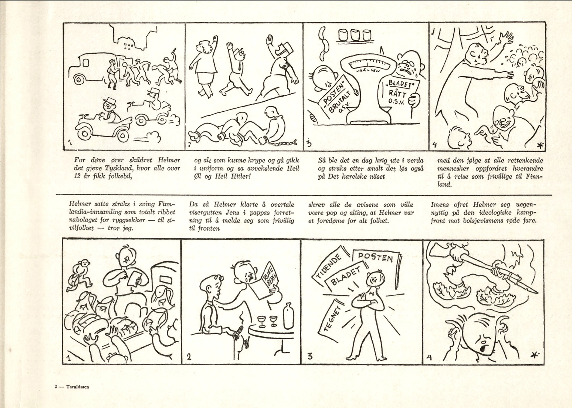 Den svært aktive avistegneren er ikke noe velkjent navn i dag, men serieskaper John Jamtli trakk ham frem fra glemselen da han startet sin suksessfulle Sabotør-serie i 2018.1 Den første boka tar for seg den kommunistiske Osvald-gruppa med lederen Asbjørn Sunde. I den sammenheng kom Jamtli over Taraldsens strek i det illegale motstandsheftet «Handbok for sabotører». Jamtli ble så begeistret at han lagde et hefte i lik stil, fylt med bakgrunnsmateriale for sin egen bok. Og tittelen, Sabotør, ble også delvis hentet fra Taraldsens hefte. Slik sett har Taraldsen hatt direkte påvirkning på de siste års tegneserieutgivelser, men er han verd å lese på egen hånd?