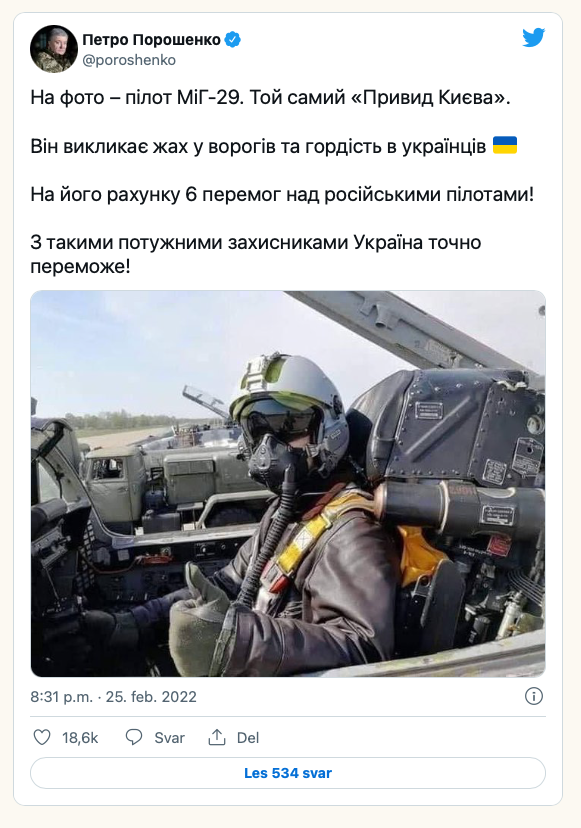 Et interessant eksempel på ukrainsk side er heltefortellingen om «spøkelset i Kyiv», formidlet i sosiale medier med hashtagen #theGhostofKyiv. Ukrainske myndigheter skrev i krigens første fase på Telegram om den ukrainske MIG-29 piloten som vant seks luftseire på 30 timer den første dagen av den russiske invasjonen. De bildene som finnes, viser en person i full jagerflyveruniform med maske som skjuler ansiktet. Piloten er ikke identifisert, noen mener det er en taxisjåfør som har tatt opp sin tidligere karriere som jagerpilot, det spekuleres også i om den myteomspunne piloten kunne være en kvinne. Mange tror fortellingen er diktet opp for å skape håp. Faktasjekkerne sier at de ikke kan bekrefte at den er usann, men heller ikke at den er sann. En skikkelig heltehistorie er det iallfall. Den skapte samhold og håp som en kraft i en tidlig periode av krigen der vanlige mennesker rustet seg til kamp. De lokale heltene i krigens første fase var nettopp menn og kvinner som satt i parkene og laget brannbomber, det var de vanlige menneskene. De som alltid rammes sterkest i krig.