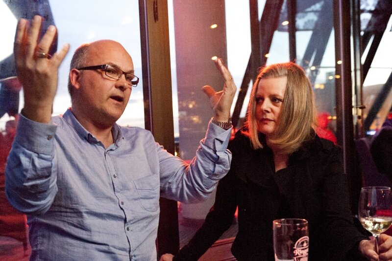 Den andre i denne samtalen deltok ikke i Storebøs tråd, men er til gjengjeld opptatt av norsk språk og retorikk i sitt daglige virke. Vi møtes på en toppetasjes hotellbar i Oslo, i et kakofonisk surr av stemmer på ulike dialekter og språk, sløv musikk, klirrende skåler; jeg tenker babelsk forvirring. Fjordutsikten og solnedgangen er det ingenting å si på.