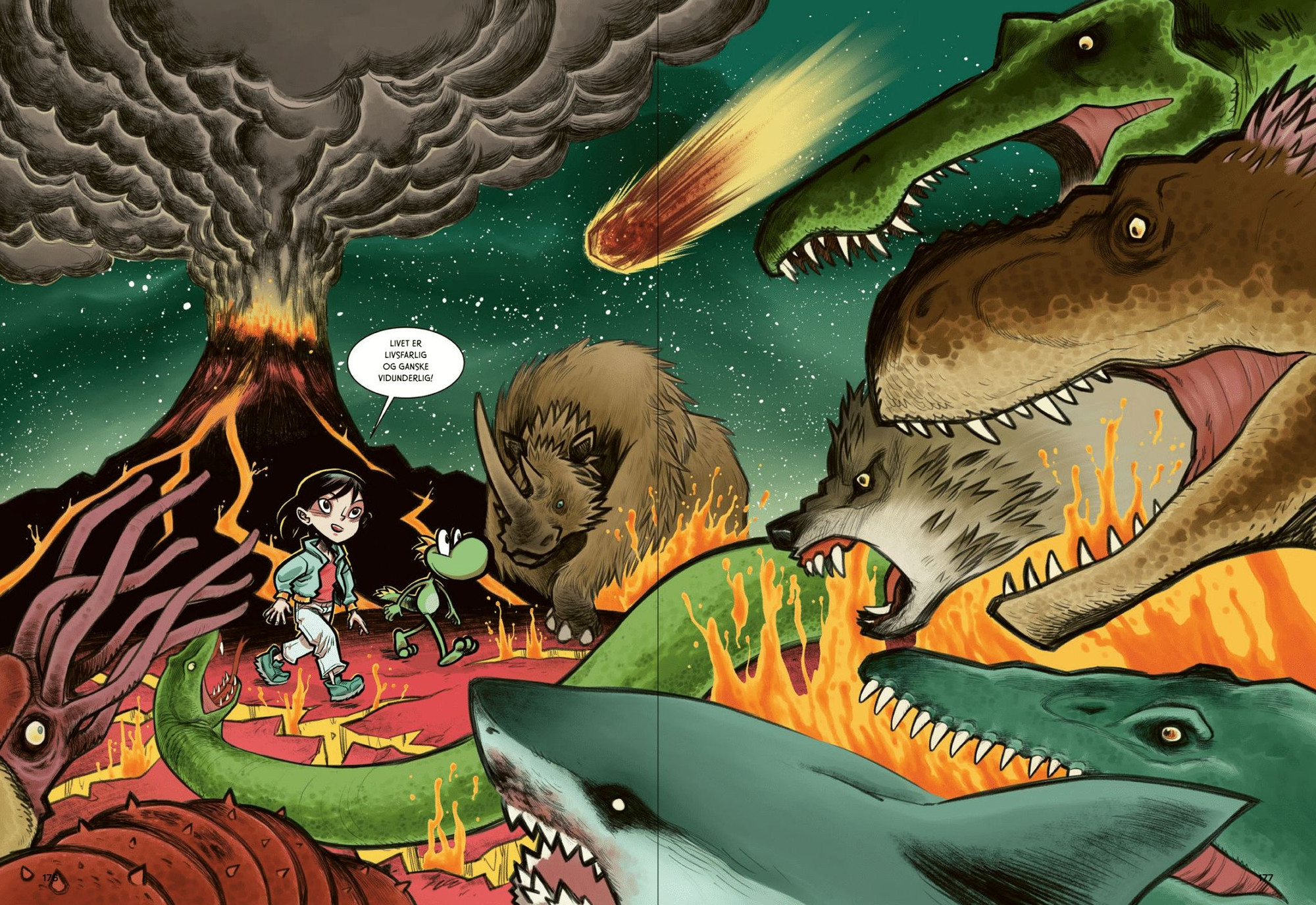 Vi blar videre til «den største masseutdødelsen noensinne» (perm-trias-utryddelsen), som jeg leser som «den største massedøden noensinne». Sånn er det når man leser for barn, det enkleste er alltid det beste. Det skal likevel nevnes at forenklingsrefleksen min stort sett er overflødig i Livet er livsfarlig!.