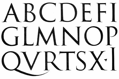 Når vi endelig får spranget fra de greske til de romerske, «keiserlige» seriffene, er overgangen dramatisk; det skjer samtidig med at bokstavene går fra monolineært til duolineært strekbilde. Seriffene endrer seg fra kjegleformede fortykkelser i enden av strøkene til fint utformede sidestrøk med avrundet overgang.